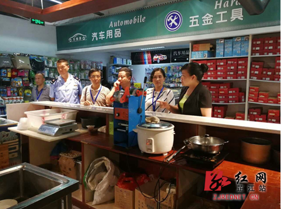 在汇报会之前,检查组一行检查了汇丰超市、中心市场食品经营情况。