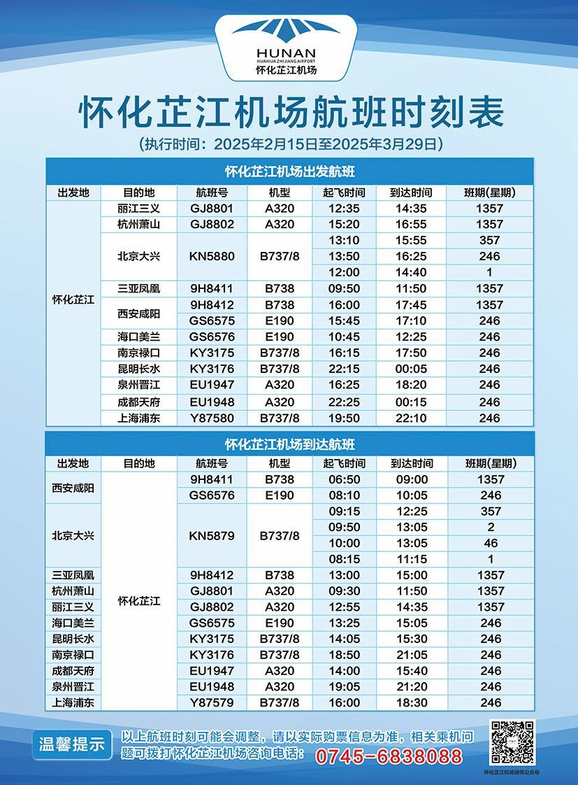 据悉,该航线由金鹏航空有限责任公司执飞,每周二、周四、周六各运营一班。来程航班号为Y87579,计划于16:00从上海浦东国际机场起飞,18:30降落在怀化芷江机场;返程航班号为Y87580,19:50从怀化芷江机场起飞,22:10抵达上海浦东国际机场,单程飞行时长约2小时20分钟,目前票价最低370元起。旅客可通过各大售票平台、金鹏航空官方网站或客服热线查询和预订机票。