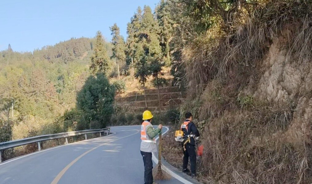 路肩杂草、藤蔓易遮挡标志牌、引发火灾,中心调集12台割草机、6台绿篱机,以“机械打草+人工拔根”方式,对路肩、边坡、景点连接线进行深度除草,清除杂草180吨,修剪绿篱55公里,补植樟树、桂花树等800株,实现“三季有花、四季常绿”。公坪镇通溪村沿线6公里“杂草带”变身“景观带”,成为村民散步打卡点。