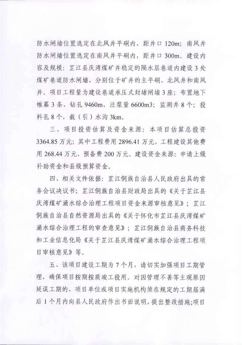 关于《芷江县庆湾煤矿涌水综合治理工程项目可行性研究报告》的批复