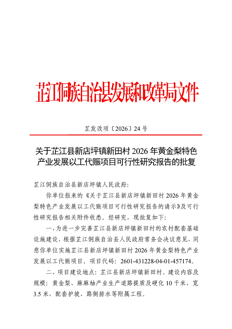 关于芷江县新店坪镇新田村2026年黄金梨特色产业发展以工代赈项目可行性研究报告的批复