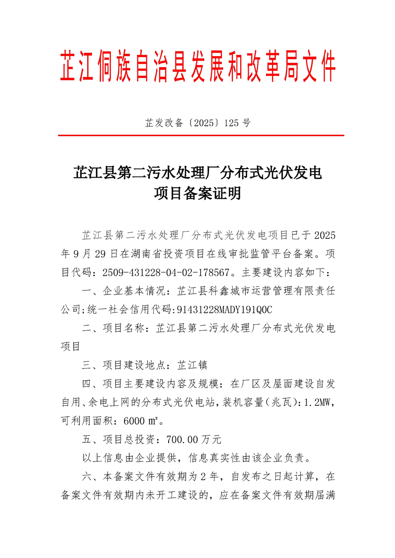芷江县第二污水处理厂分布式光伏发电项目备案证明