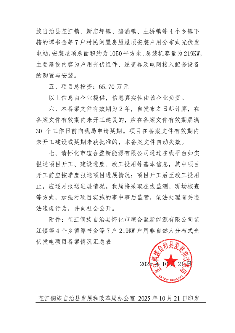 芷江侗族自治县怀化市暄合盈新能源有限公司芷江镇等4个乡镇谭书金等7户219KW户用非自然人分布式光伏发电项目备案证明