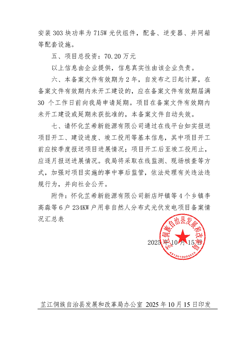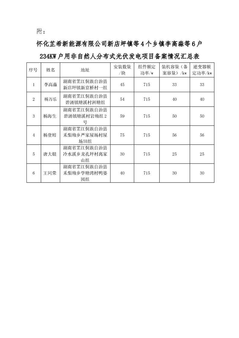 怀化芷希新能源有限公司新店坪镇等4个乡镇李高淼等6户234KW户用非自然人分布式光伏发电项目备案证明