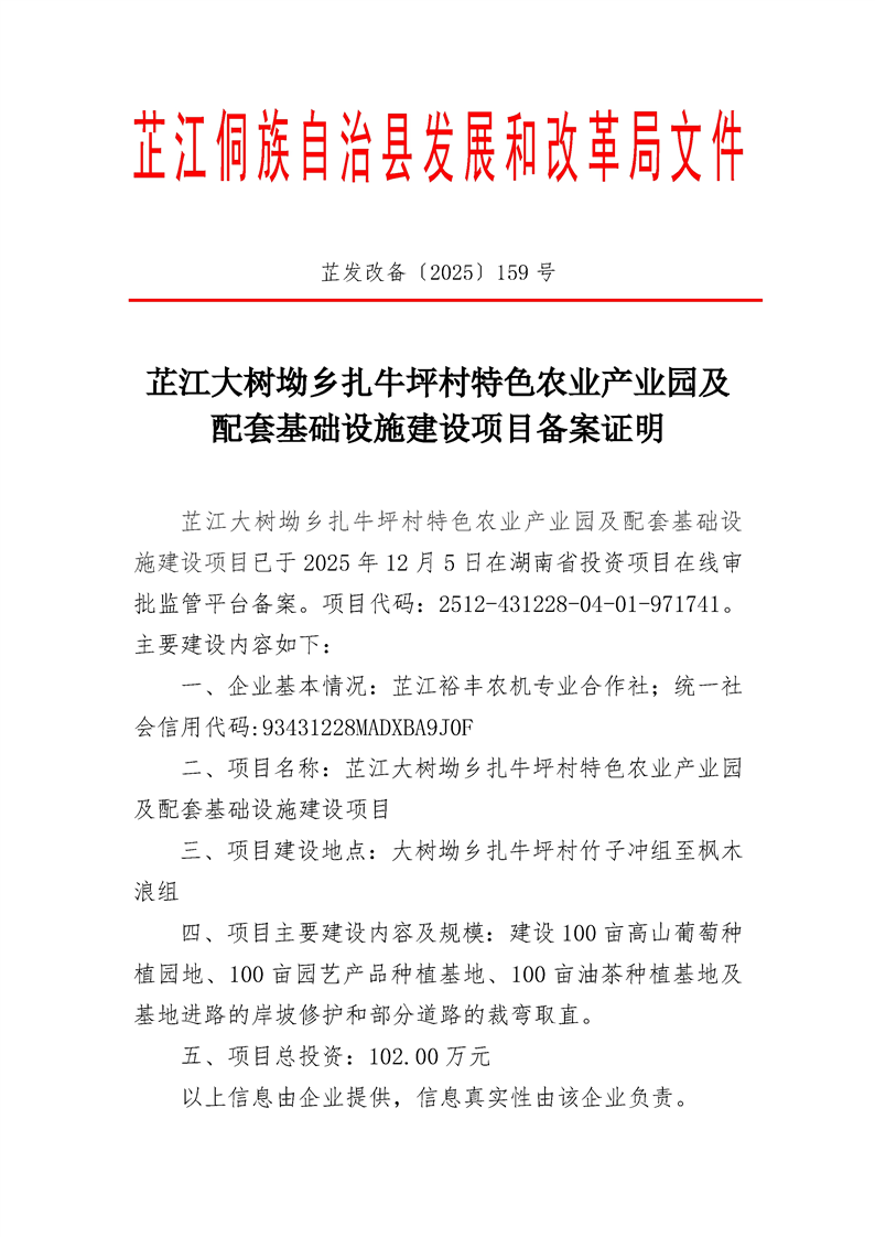芷江大树坳乡扎牛坪村特色农业产业园及配套基础设施建设项目备案证明