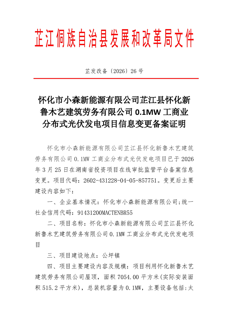 怀化市小森新能源有限公司芷江县怀化新鲁木艺建筑劳务有限公司0.1MW工商业分布式光伏发电项目信息变更备案证明