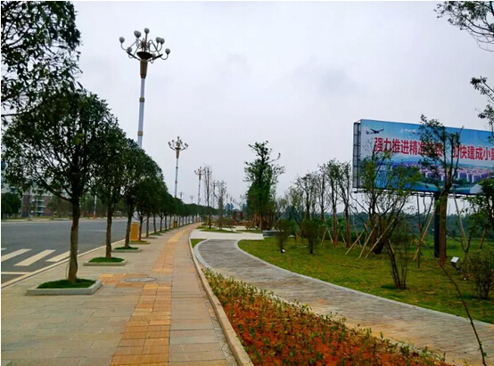 人行道路板铺设和绿化风光带已经完工的迎宾路。