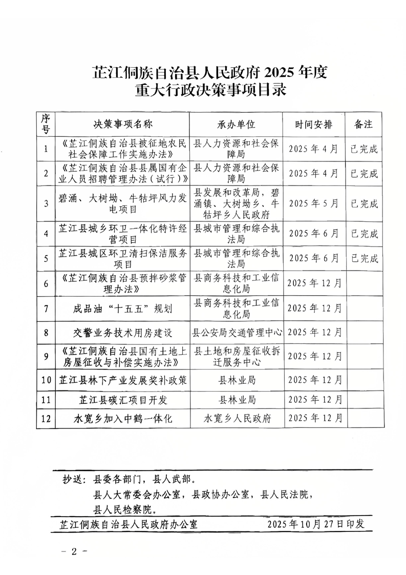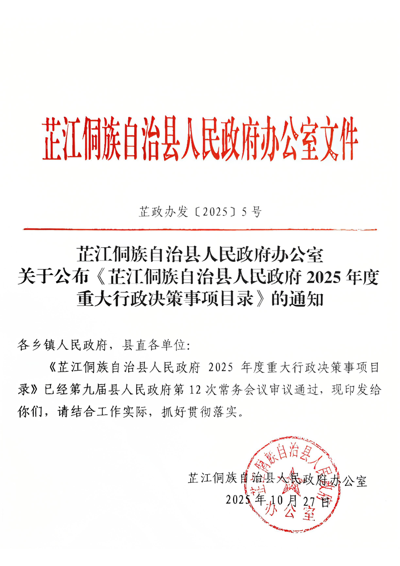 芷江侗族自治县人民政府办公室关于公布《芷江侗族自治县人民政府2025年度重大行政决策事项目录》的通知