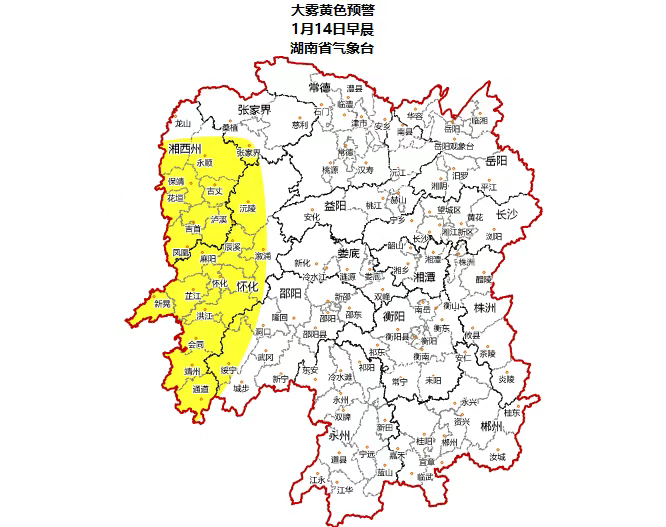 防范14日清晨湘西部分地区大雾造成低能见度对交通出行的影响。