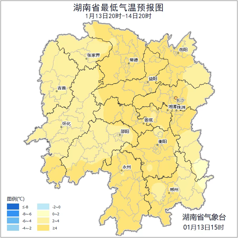 湖南省气象台预计 未来三天 全省大部地区 以晴天间多云天气为主 15日晚至16日白天 湘西部分地区有小雨,局地中雨 另外,14日清晨 湘西部分地区有雾 大雾黄色预警 湖南省气象台01月13日16时发布大雾黄色预警:预计14日早晨,湘西大部分地区将出现能见度不足500米的雾或雨雾,局部能见度低于200米,将对交通产生较大影响。黄色预警区域:湘西州、张家界南部、怀化、邵阳西部。 未来三天全省预报