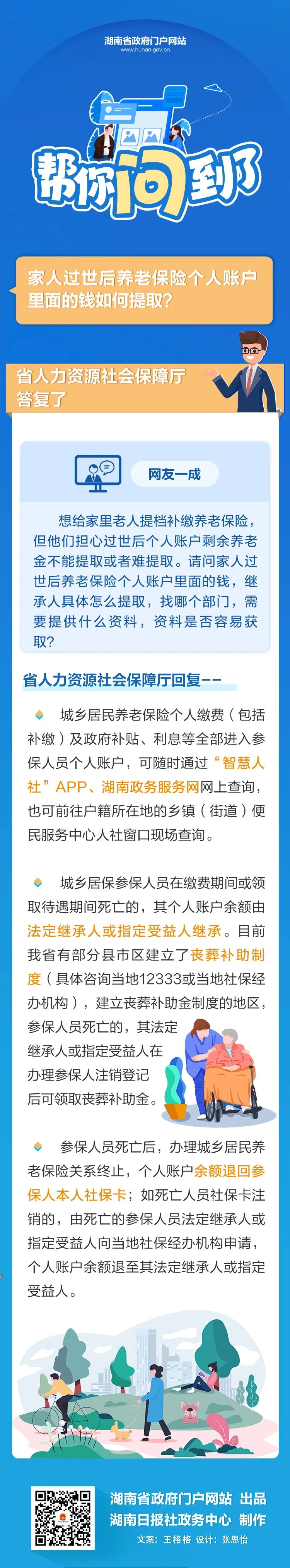 家人过世后养老保险个人账户里面的钱如何提取?帮你问到了! 芷江侗族自治县人民政府 发布时间: 2025-12-19 16:49 你有关切,我有回应。湖南省人民政府网站联合湖南日报社推出——“帮你问到了”栏目,带来有关部门对百姓关注话题的权威回应。更多你关心的问题,欢迎文后留言或私信,我们会定期汇总并转送相关部门,帮你问到答案。 分享到 打印 来源:湖南省人民政府网