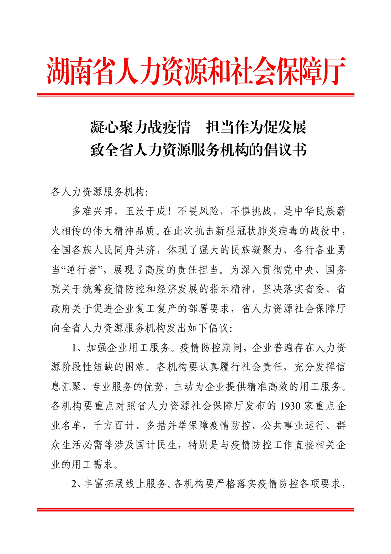 凝心聚力战疫情 担当作为促发展 致全省人力资源服务机构的倡议书