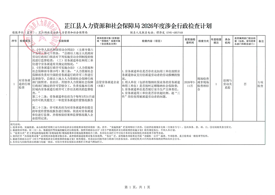 芷江县人力资源和社会保障局2026年度涉企行政检查计划
