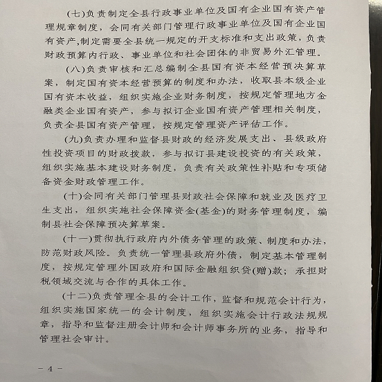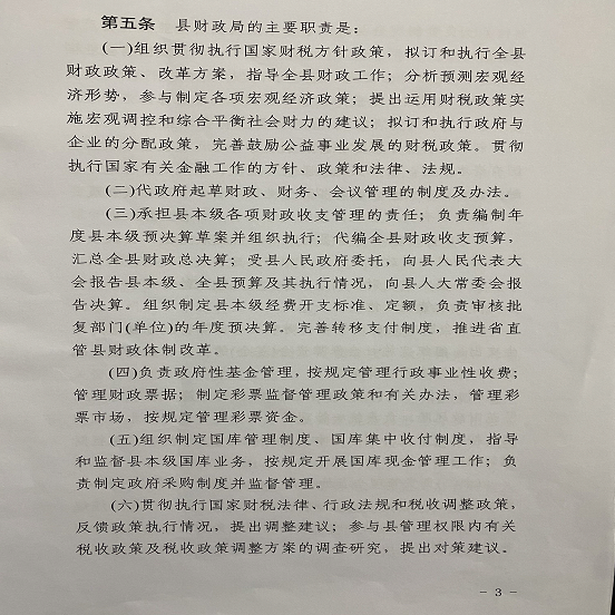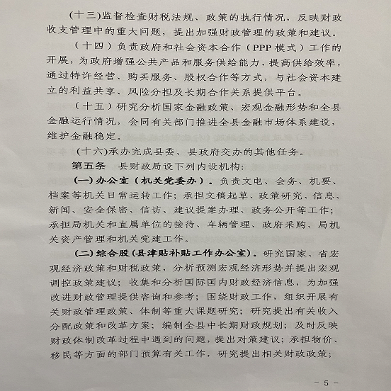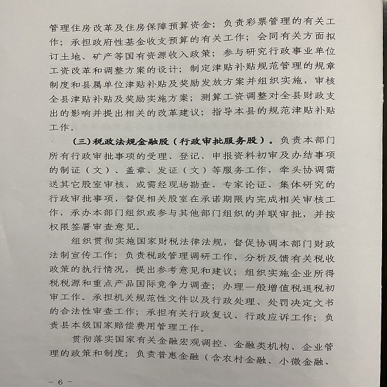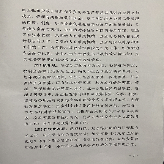 (五)行政政法股。(负责人:谭春 联系电话:6854089)。承担行政、政法等方面的部门预算有关工作,研究提出相关财政政策;组织实施《行政单位财务规则》等有关财务管理制度;负责制定会议费、差旅费等政府性开支标准;承担县本级有关会议经费的审核管理工作;负责行政政法相关专项资金管理工作;承担统一着装管理工作。