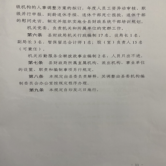 (十五)人事教育股。(负责人:谭燕萍 联系电话:6821619)。负责局机关、乡镇财政所、下属二级机构的人事调整方案的拟订,年度人员工资异动审核、职级并行申报、到龄退休手续、退休干部死亡报批、退休干部的慰问走访。制定并组织实施全县财政系统干部培训规划。