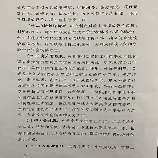 (十二)绩效评价股。(负责人:李春 联系电话:6828260)。研究制定财政支出绩效评价政策、制度和办法,建立财政支出绩效评价指标体系和评价标准;组织实施县级财政支出项目的绩效评价工作;建立健全绩效管理信息库,研究绩效评价结果应用,为制定财政政策和分配财政资金提供依据。