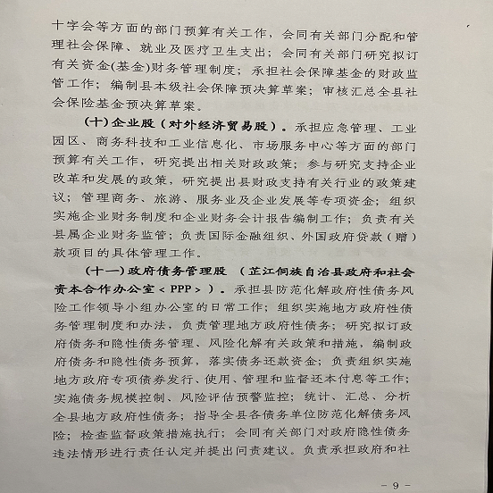 (十一)政府债务管理股 (芷江侗族自治县政府和社会资本合作办公室﹤PPP﹥)(负责人:吴小军 联系电话:6821931)。承担县防范化解政府性债务风险工作领导小组办公室的日常工作;组织实施地方政府性债务管理制度和办法,负责管理地方政府性债务;研究拟订政府债务和隐性债务管理、风险化解有关政策和措施,编制政府债务和隐性债务预算,落实债务还款资金;负责组织实施地方政府专项债券发行、使用、管理和监督还本付息等工作;实施债务规模控制、风险评估预警监控;统计、汇总、分析全县地方政府性债务;指导全县各债务单位防范化解债务风险;检查监督政策措施执行;会同有关部门对政府隐性债务违法情形进行责任认定并提出问责建议。负责承担政府和社会资本合作相关的政策研究、咨询服务、能力建设、项目识别评估、融资支持、信息统计、PPP项目信息库管理、协助项目绩效评价、项目监督检查工作。