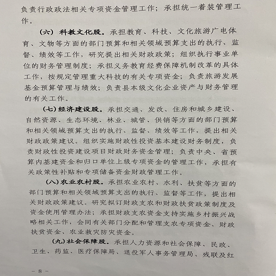 (九)社会保障股。(负责人:张璐 联系电话:6822435)。承担人力资源和社会保障、民政、卫生、药监、医疗保障局、退役军人事务管理局、残联及红十字会等方面的部门预算有关工作,会同有关部门分配和管理社会保障、就业及医疗卫生支出;会同有关部门研究拟订有关资金(基金)财务管理制度;承担社会保障基金的财政监管工作;编制县本级社会保障预决算草案;审核汇总全县社会保险基金预决算草案。