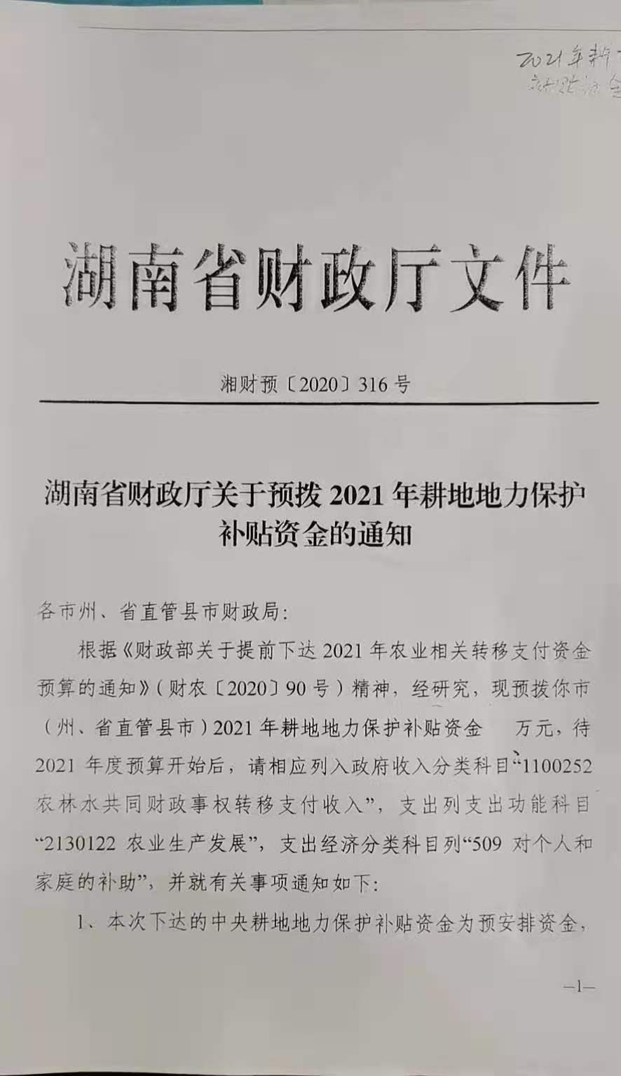 湖南省财政厅关于拨付2021年耕地地力保护补贴资金的通知