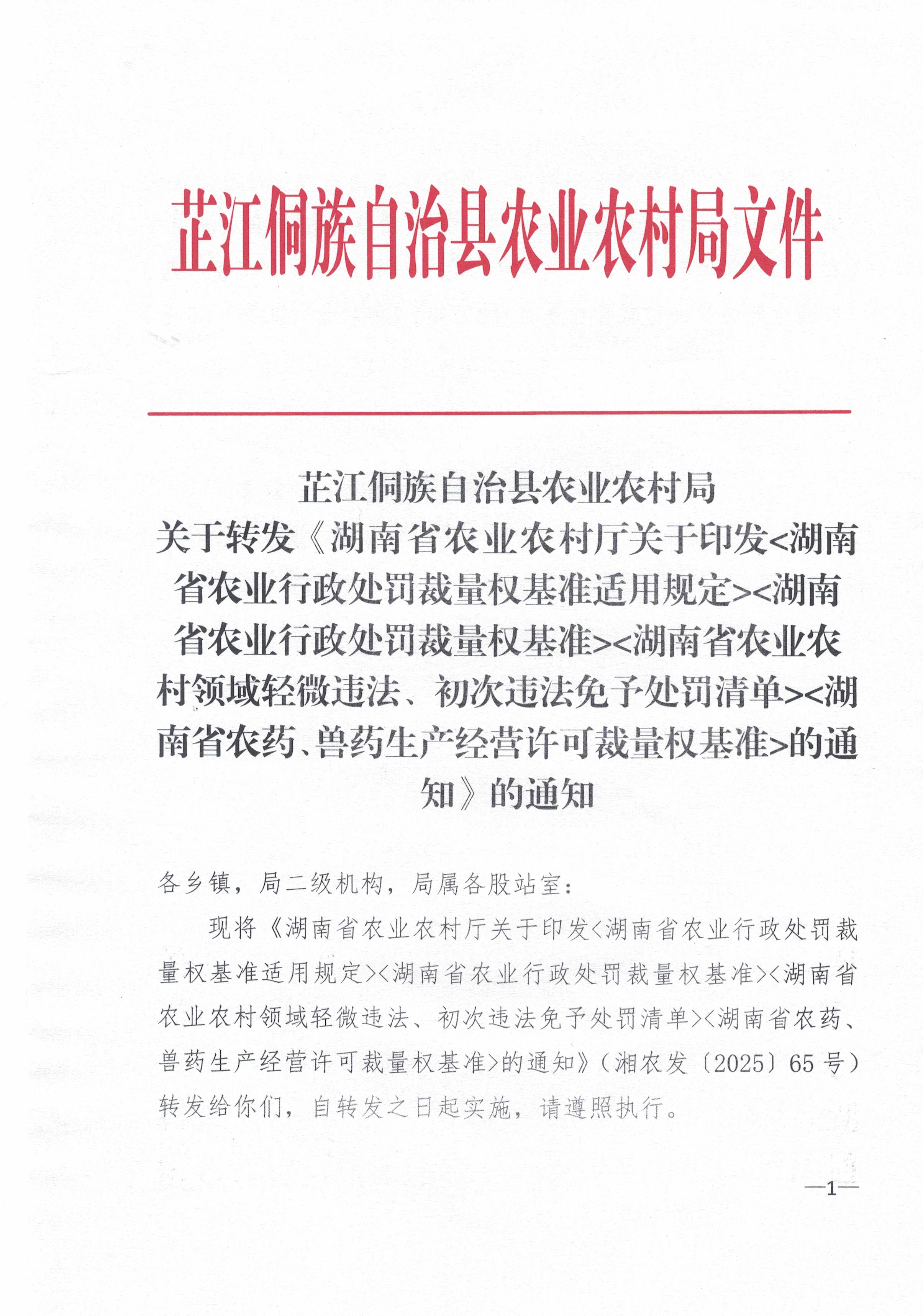 芷江侗族自治县农业农村局关于转发《湖南省农业农村厅关于印发湖南省农业行政处罚裁量权基准适用规定湖南省农业行政处罚裁量权基准湖南省农业农村领域轻微违法、初次违法免予处罚清单湖南省农药、兽药生产经营许可裁量权基准的通知》