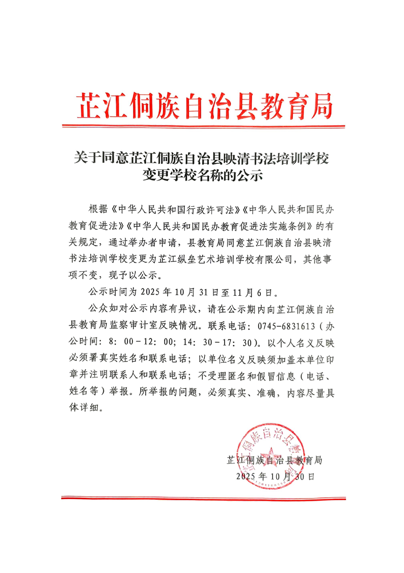 关于同意芷江侗族自治县映清书法培训学校变更学校名称的公示