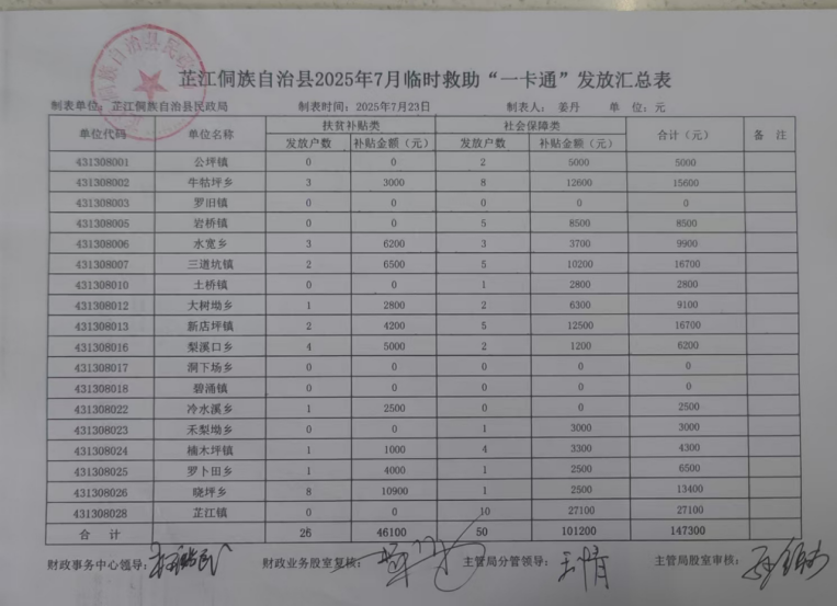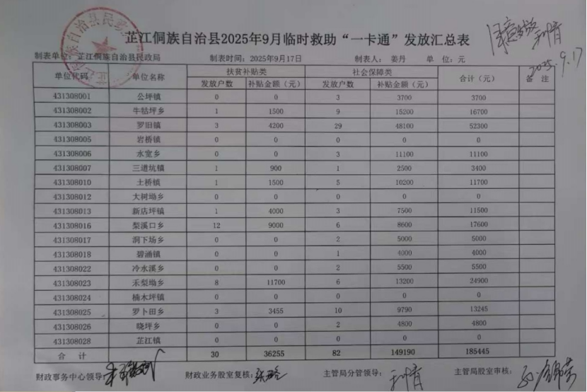 芷江侗族自治县民政局2025年临时救助3季度发放