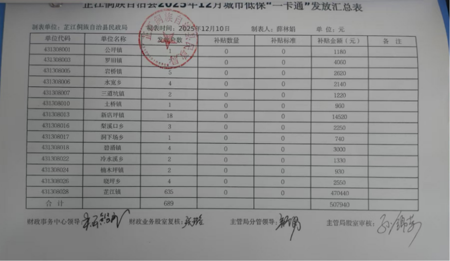 芷江侗族自治县民政局2025年最低生活保障4季度发放