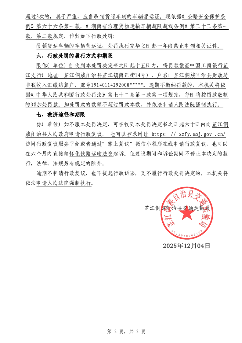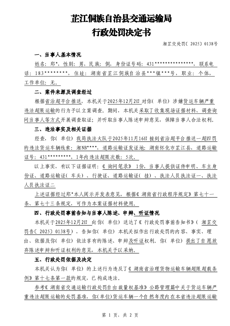 芷江侗族自治县交通运输局行政处罚决定书---湘芷交处罚〔2025〕0138号