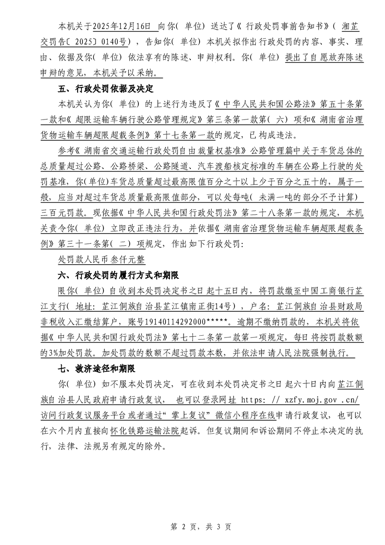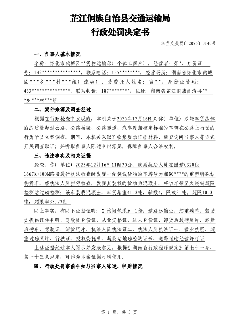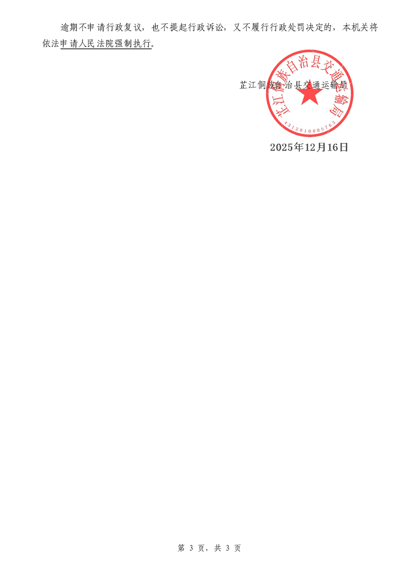 芷江侗族自治县交通运输局行政处罚决定书---湘芷交处罚〔2025〕0140号