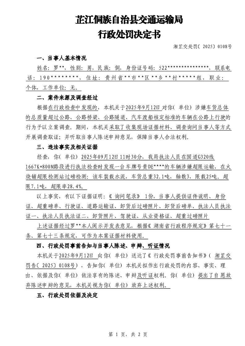 芷江侗族自治县交通运输局行政处罚决定书---湘芷交处罚〔2025〕0108号