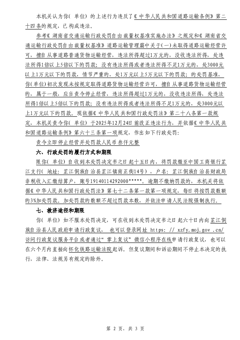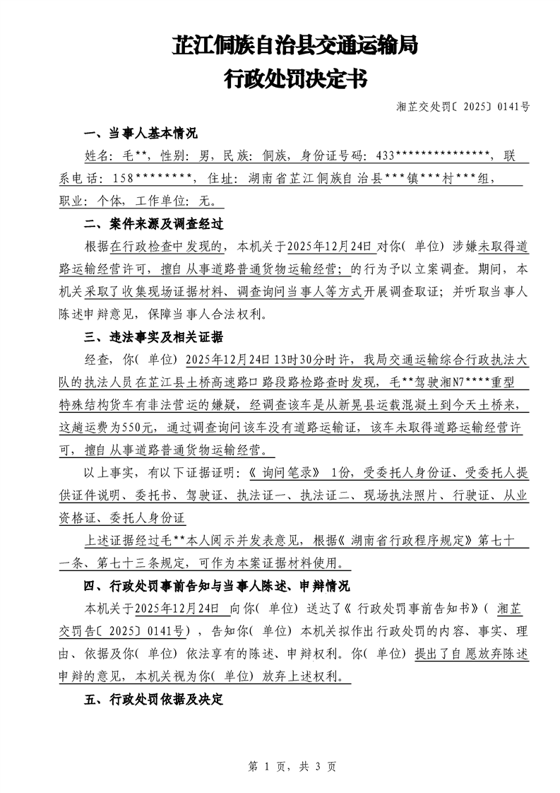 芷江侗族自治县交通运输局行政处罚决定书---湘芷交处罚〔2025〕0141号