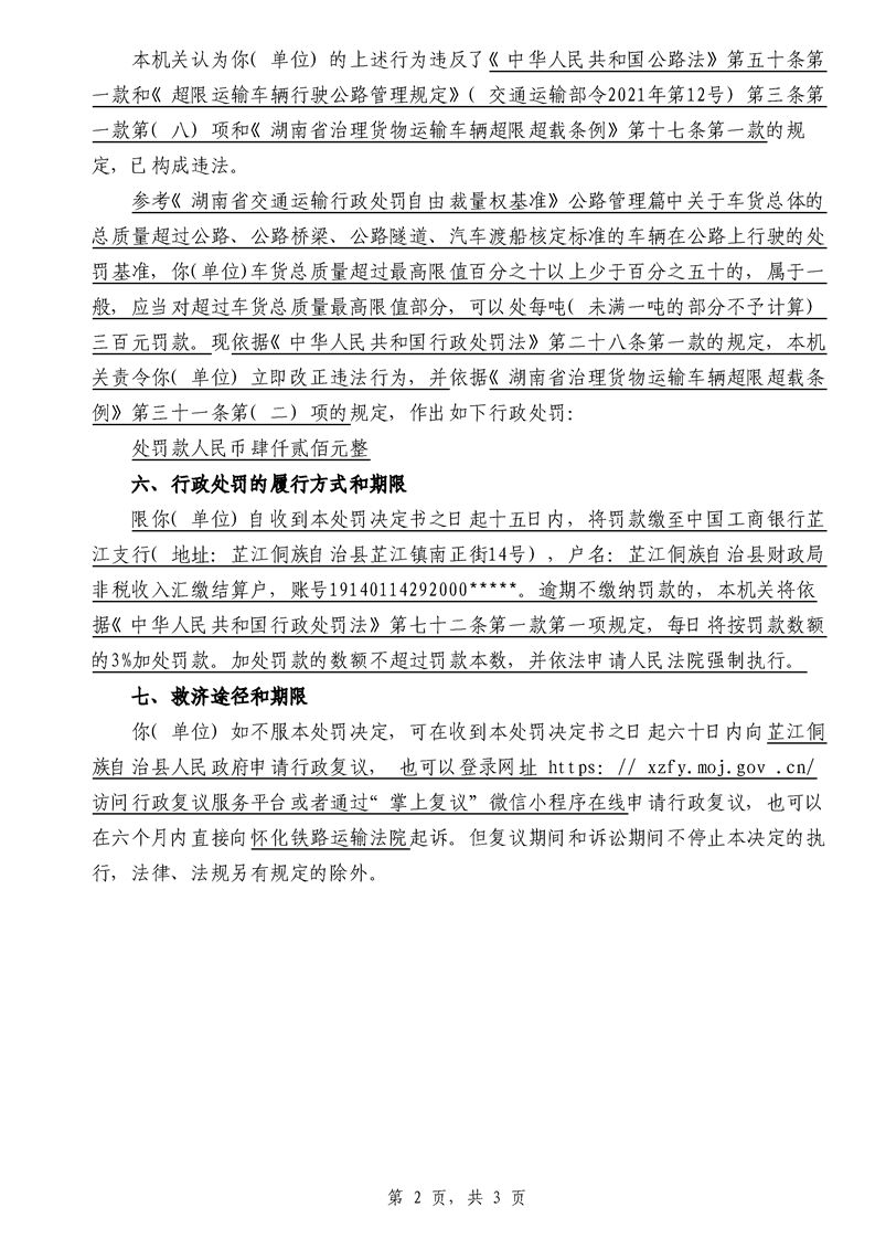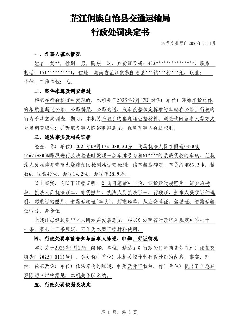 芷江侗族自治县交通运输局行政处罚决定书---湘芷交处罚〔2025〕0111号