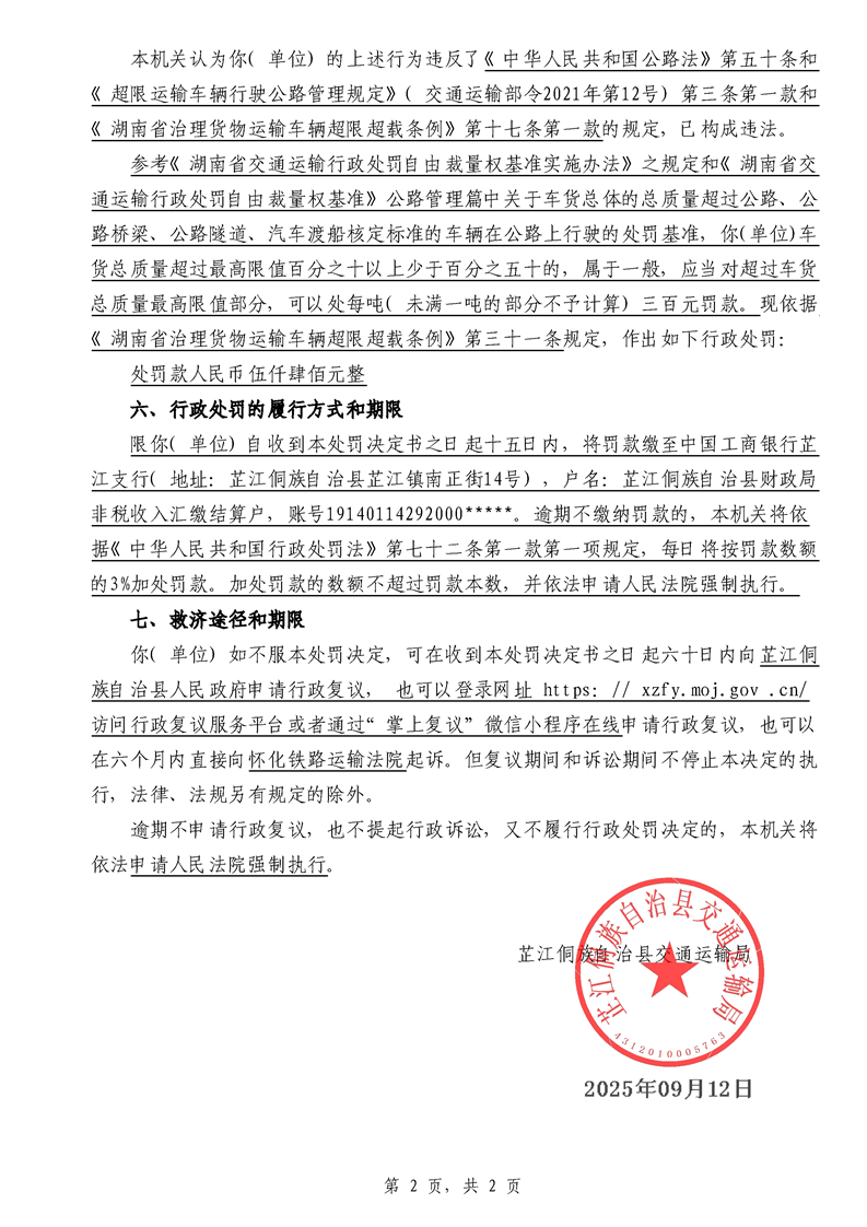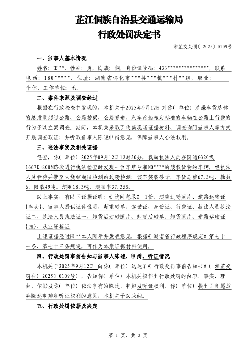 芷江侗族自治县交通运输局行政处罚决定书---湘芷交处罚〔2025〕0109号