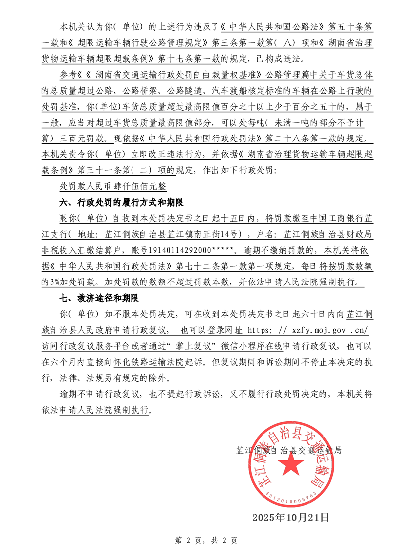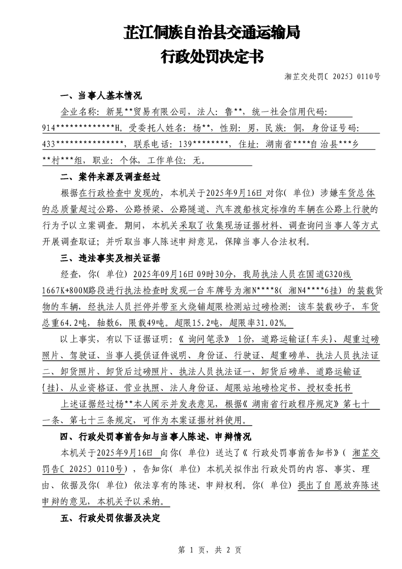芷江侗族自治县交通运输局行政处罚决定书---湘芷交处罚〔2025〕0110号