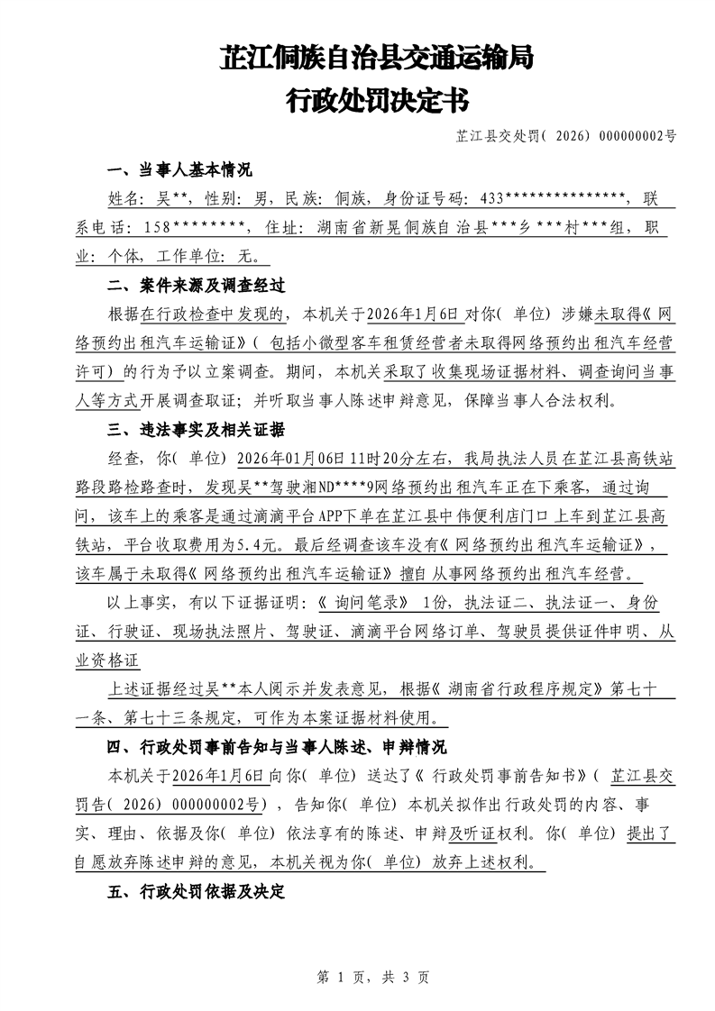 芷江侗族自治县交通运输局行政处罚决定书---湘芷交处罚〔2026〕0002号