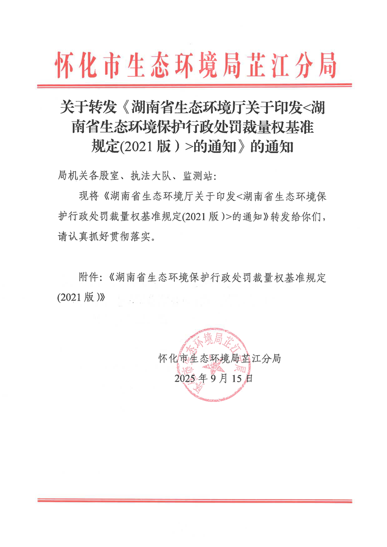 关于转发《湖南省生态环境厅关于印发湖南省生态环境保护行政处罚裁量权基准规定(2021版)的通知》的通知 芷江侗族自治县人民政府 发布时间: 2025-09-18 14:00 分享到 打印 来源:市生态环境局芷江分局