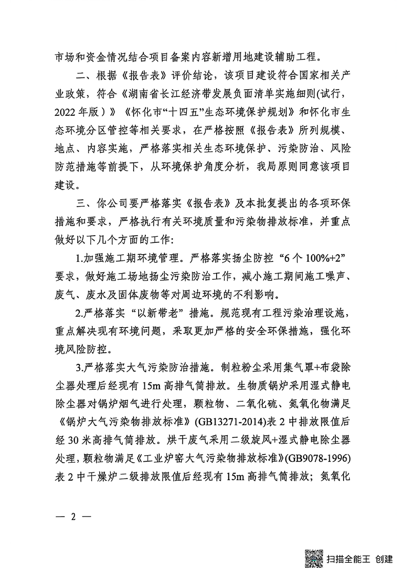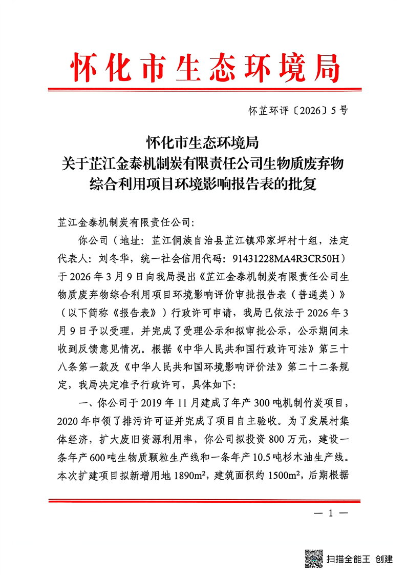 《关于芷江金泰机制炭有限责任公司生物质废弃物综合利用项目环境影响报告表》批复