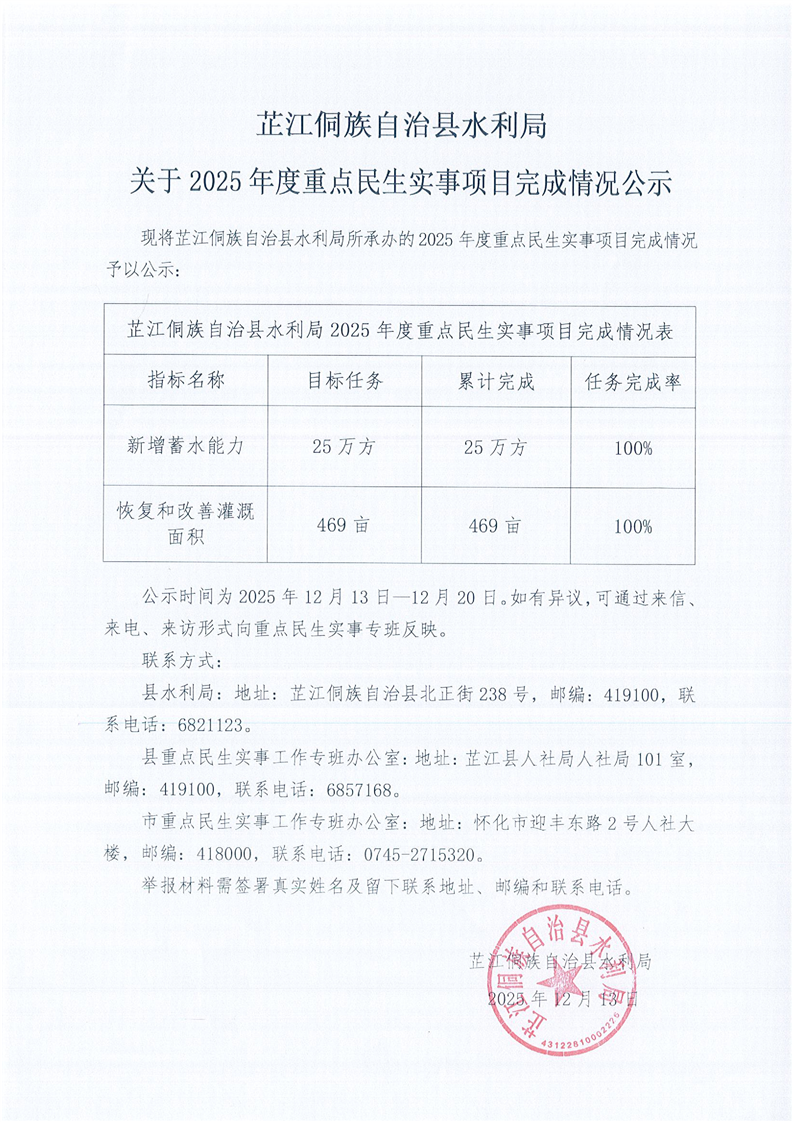 芷江侗族自治县水利局关于2025年度重点民生实事项目完成情况公示