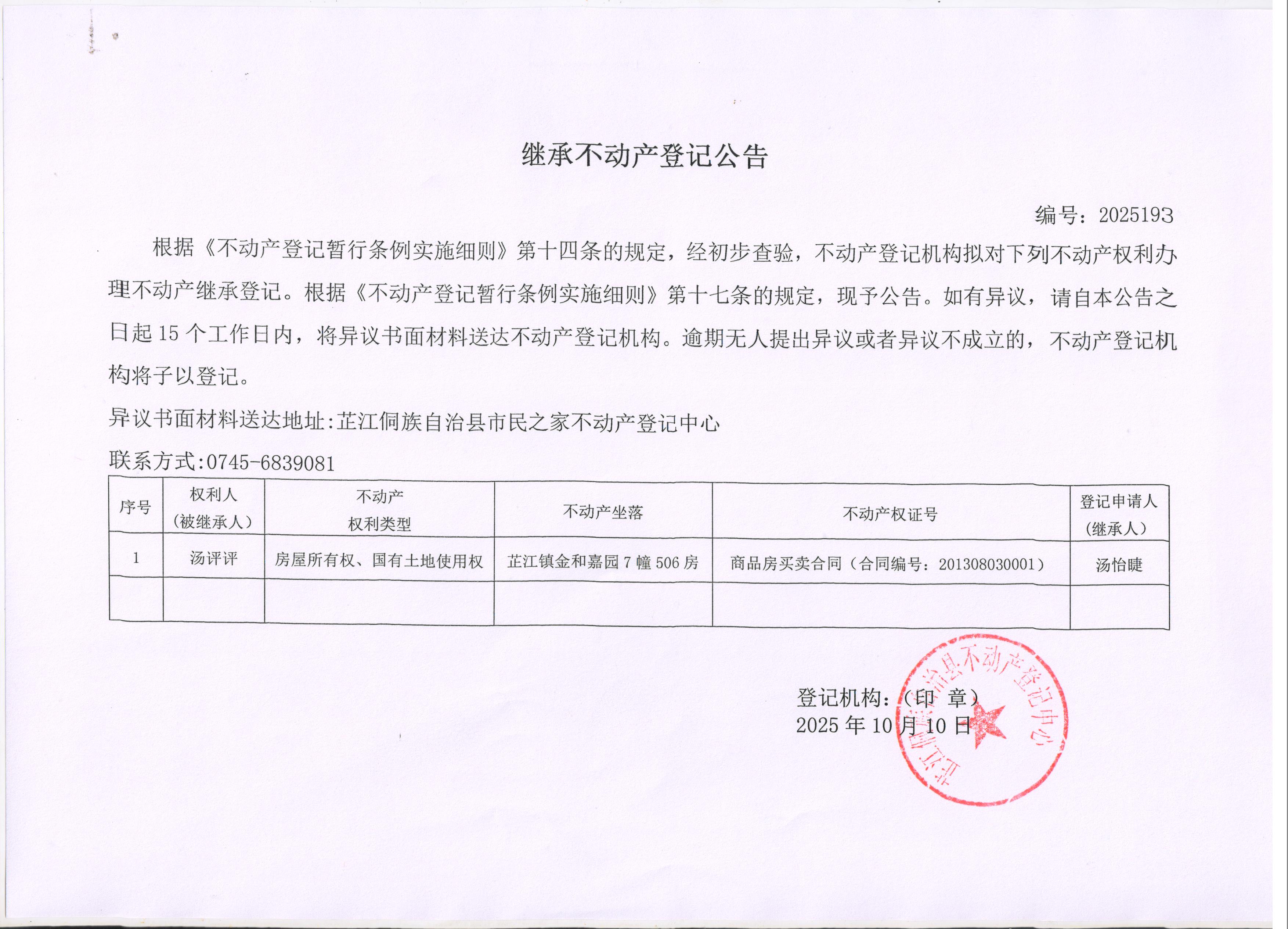 继承不动产登记公告 编号:2025193