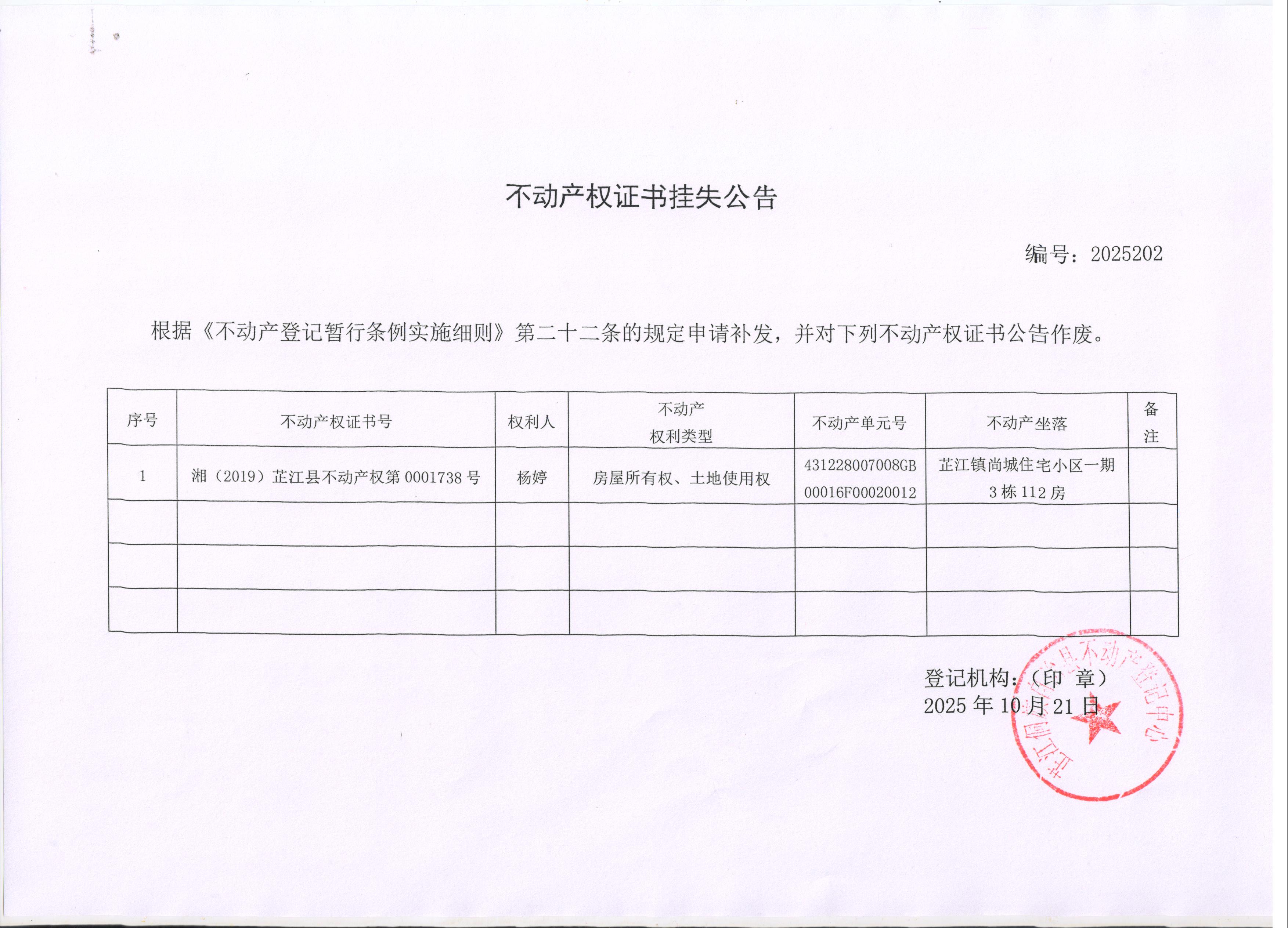 不动产权证书挂失公告 编号:2025202