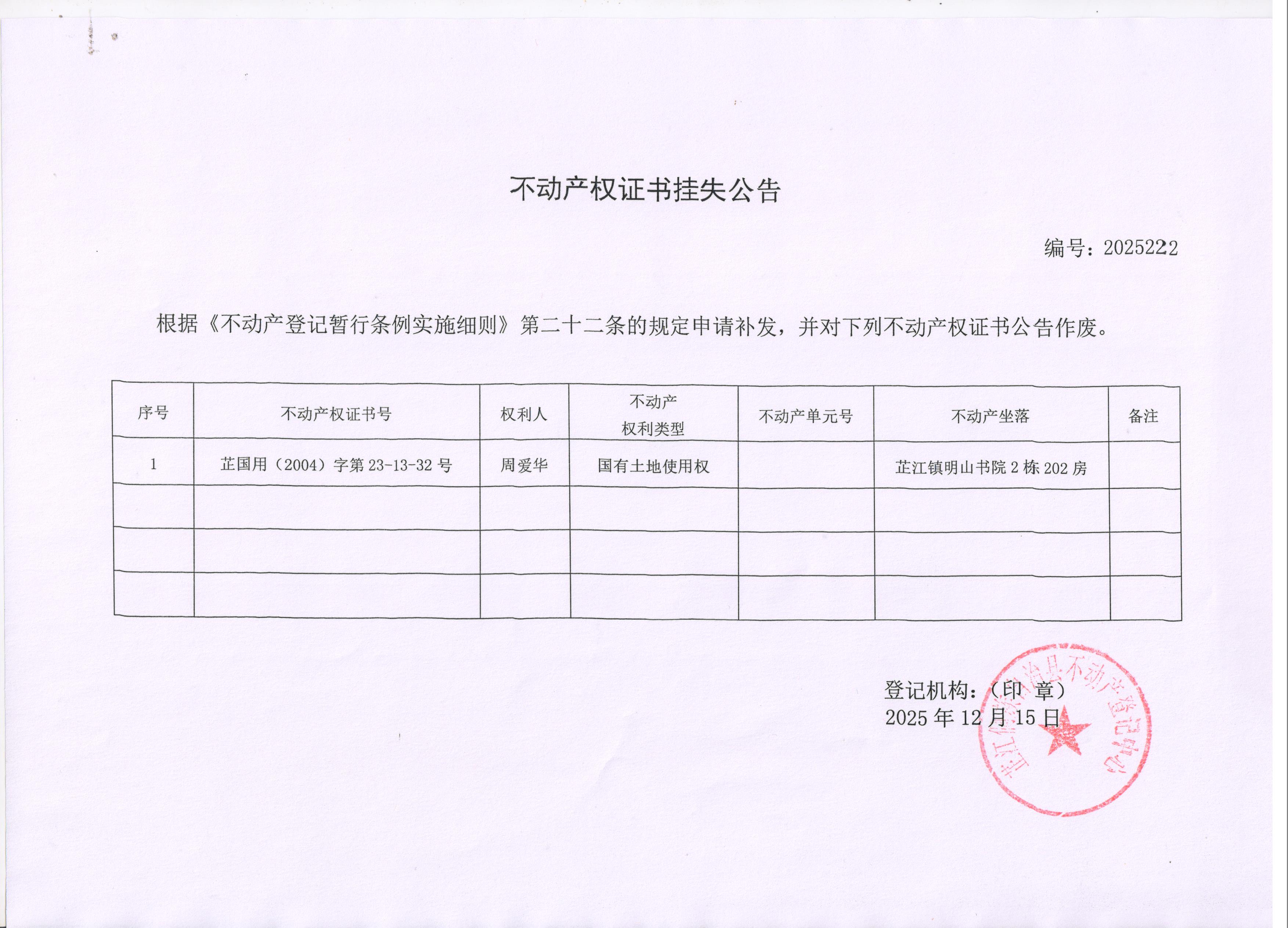 不动产权证书挂失公告 编号:2025222