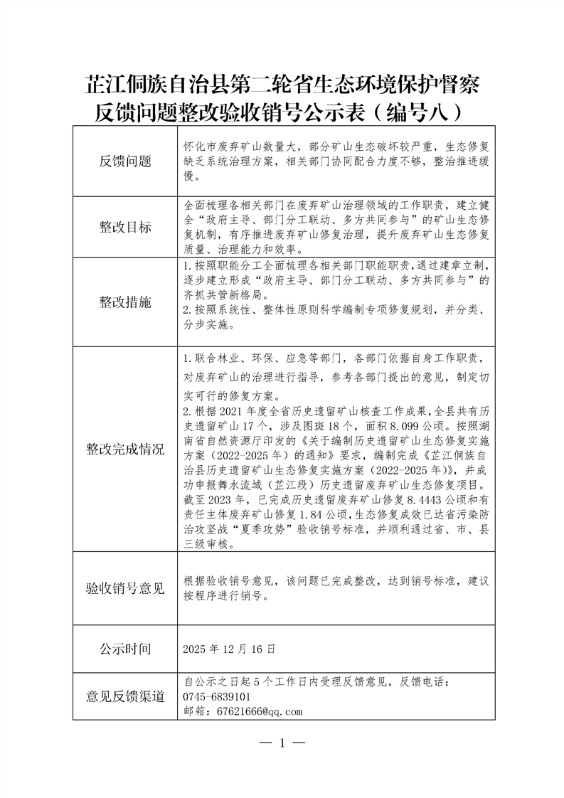 怀化市第二轮省生态环境保护督察反馈问题整改验收销号公示表(编号八)