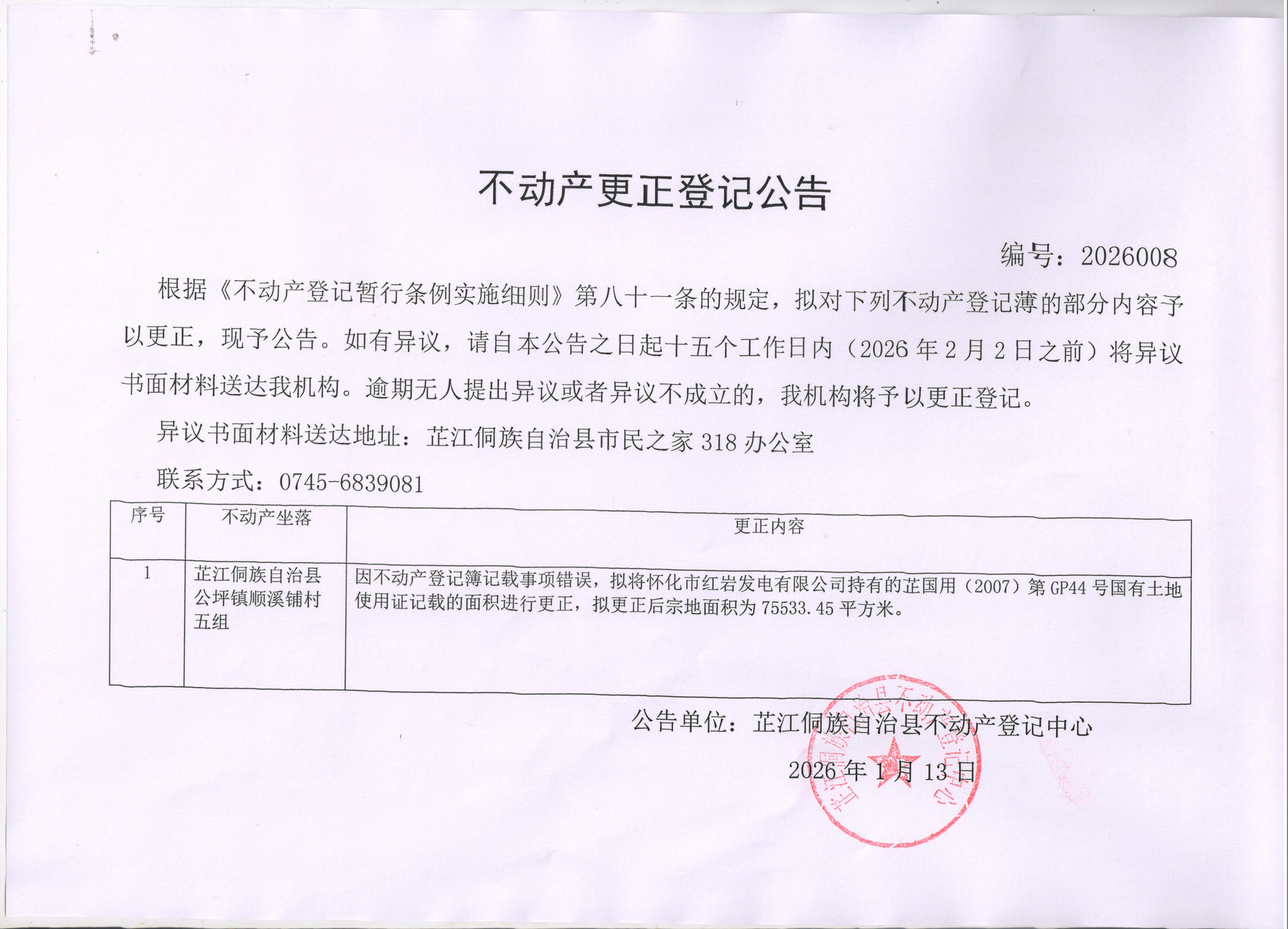 不动产更正登记公告 编号:2026008
