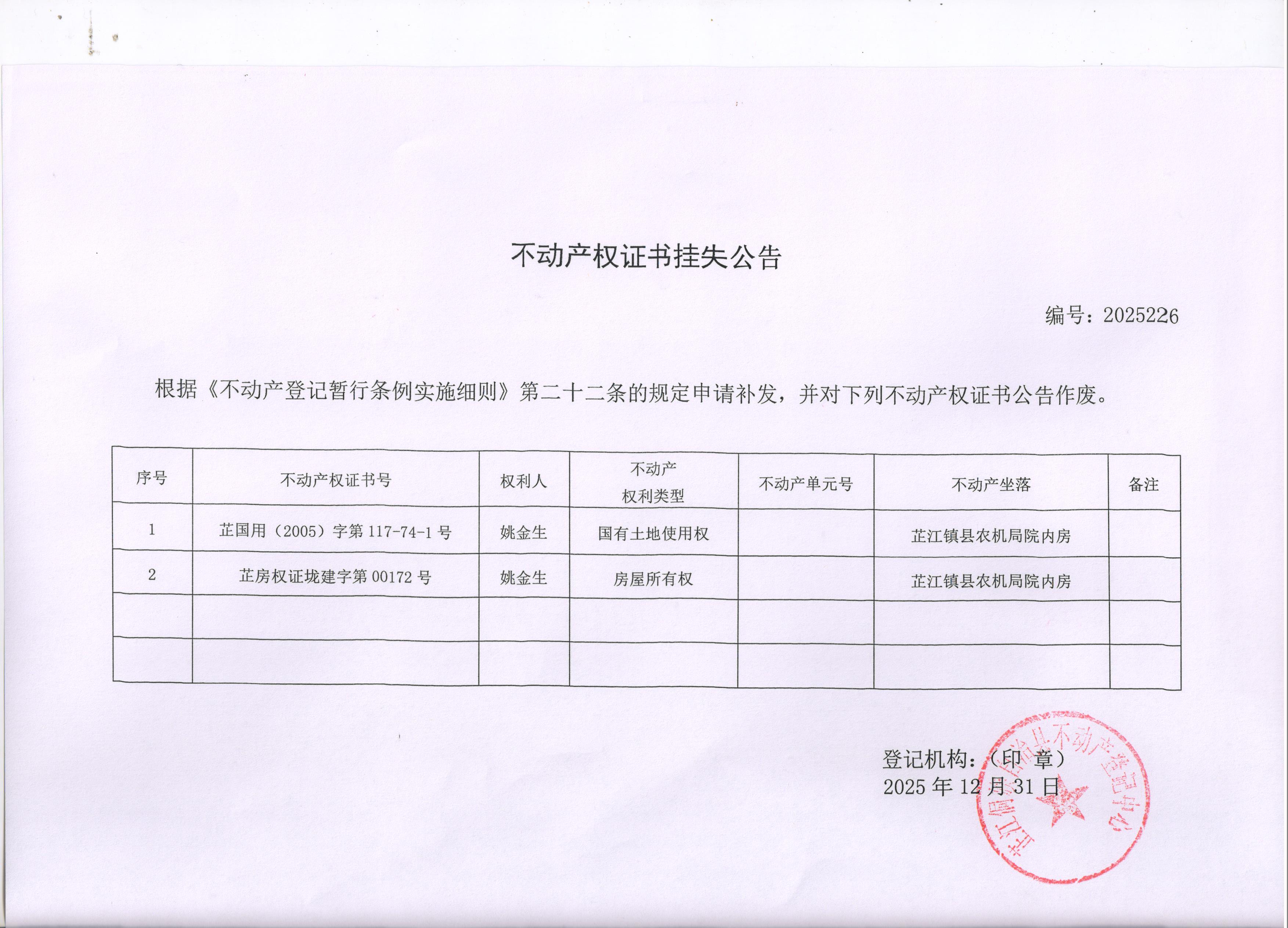 不动产权证书挂失公告 编号:2025226