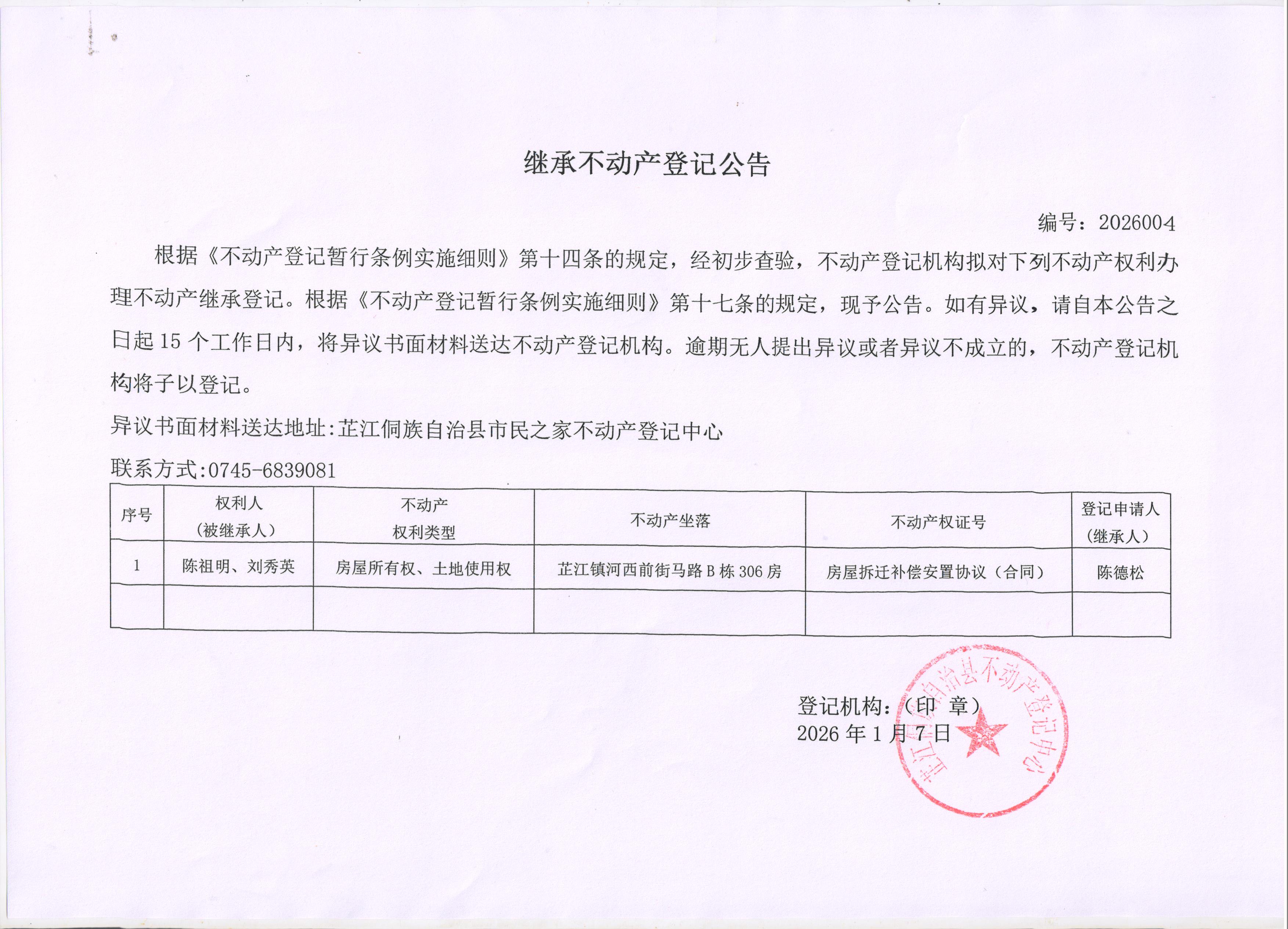 继承不动产登记公告 编号:2026004