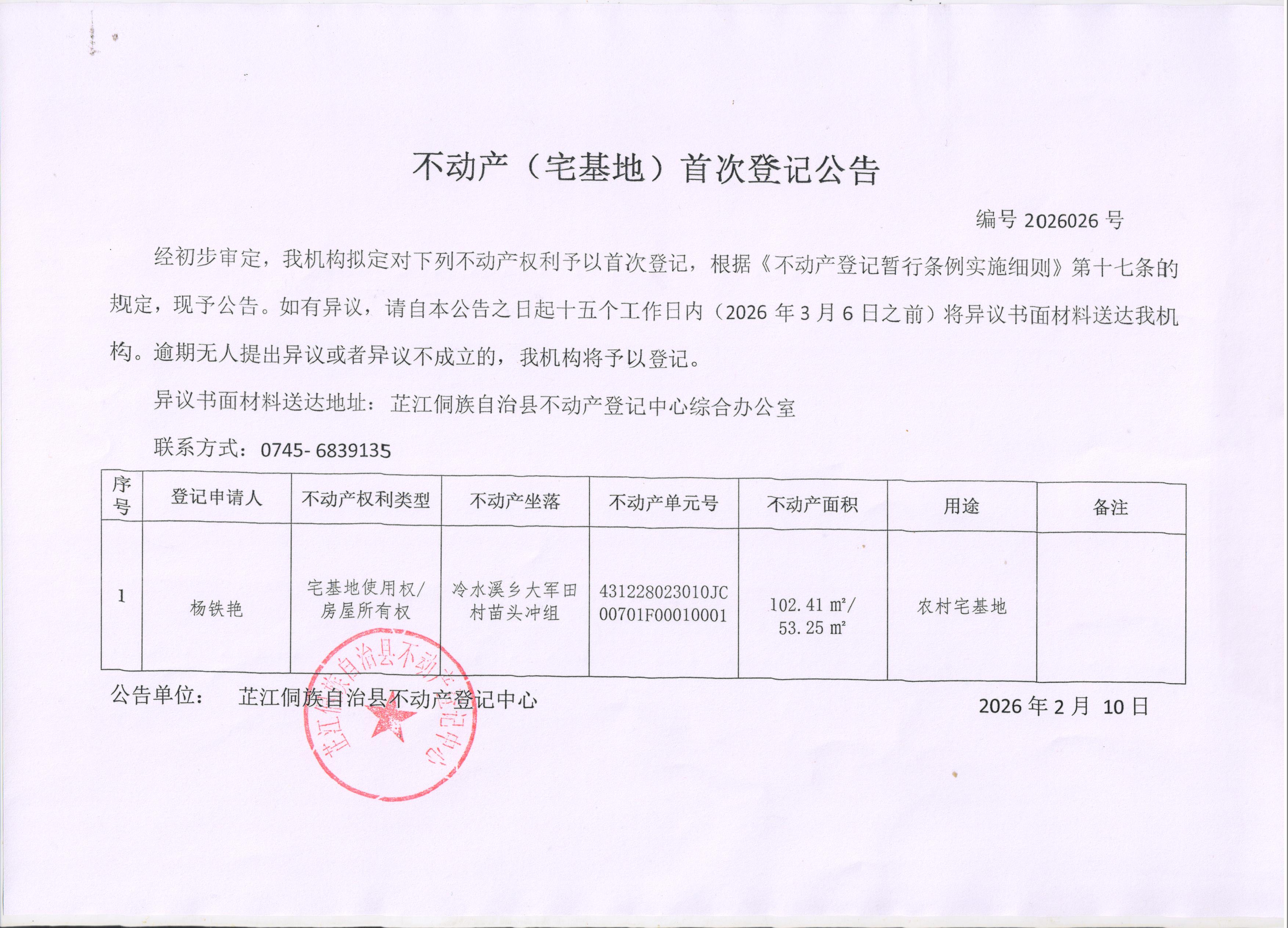 不动产(宅基地)首次登记公告 编号:2026026