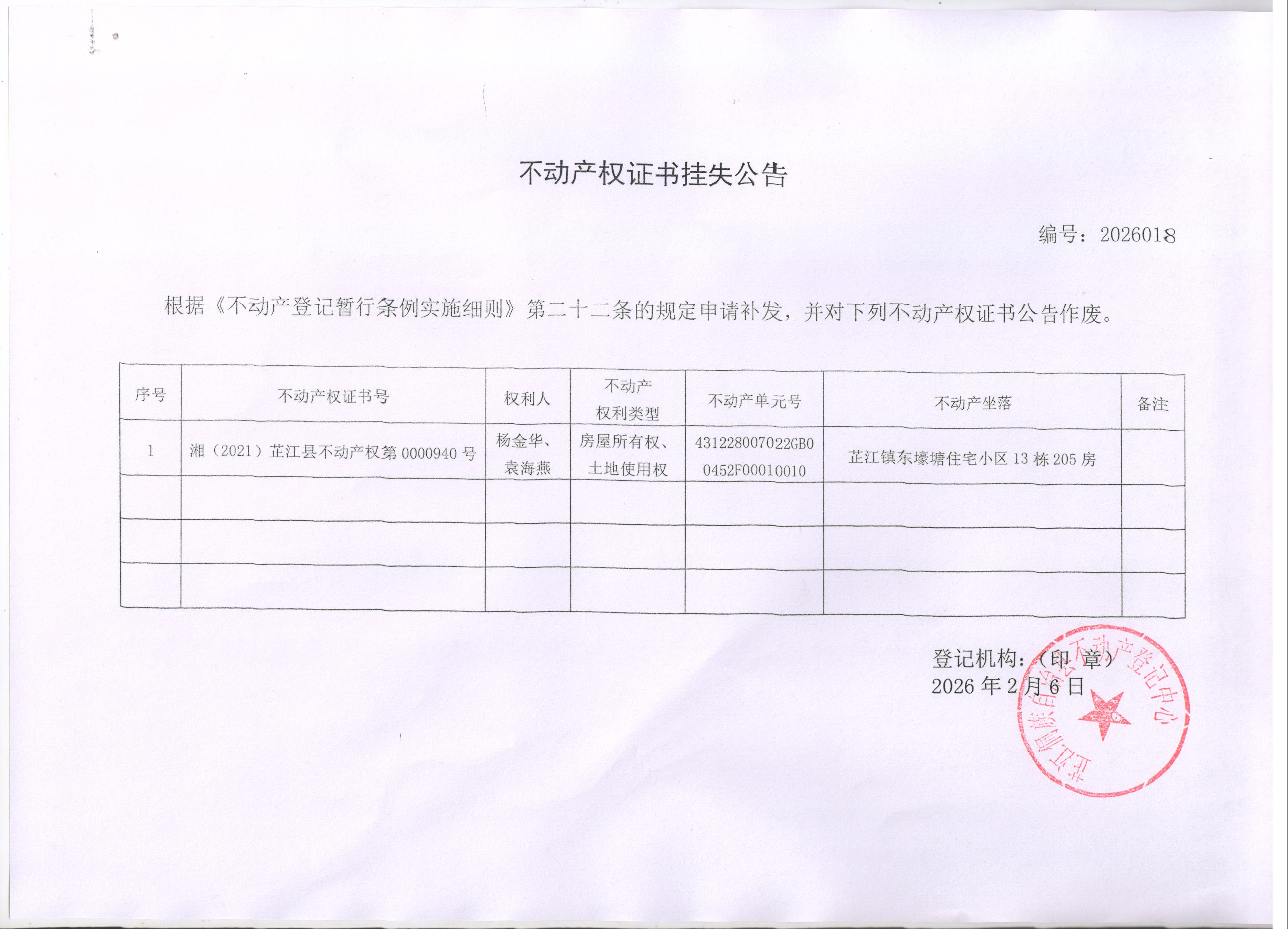 不动产权证书挂失公告 编号:2026018