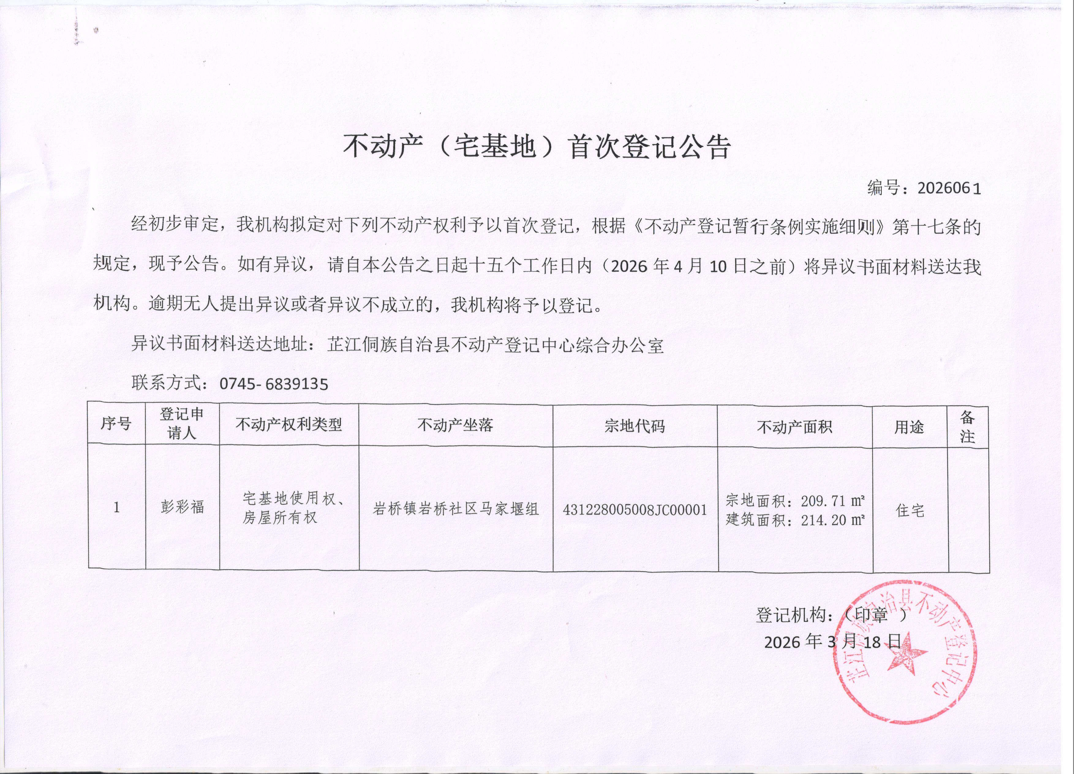 不动产(宅基地)首次登记公告 编号:2026061