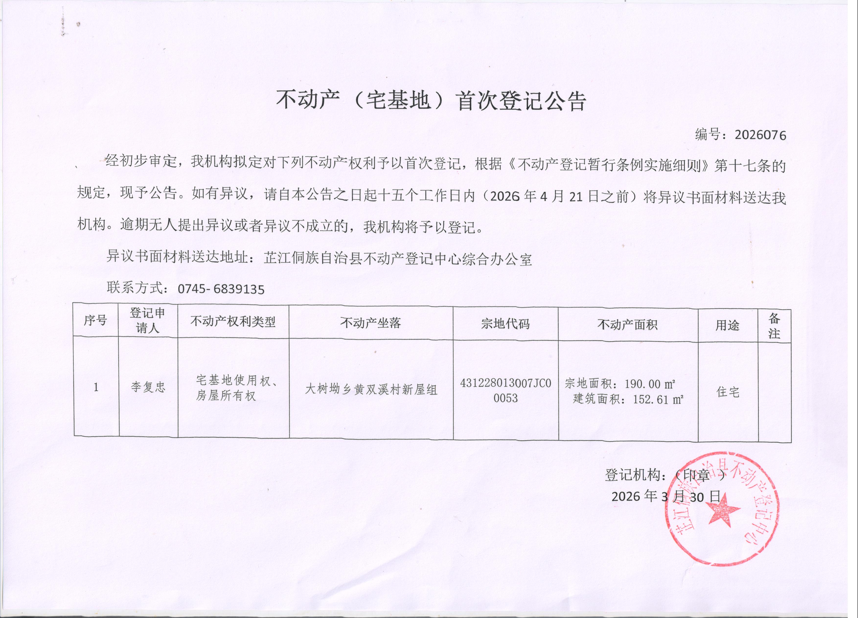 不动产(宅基地)首次登记公告 编号:2026076