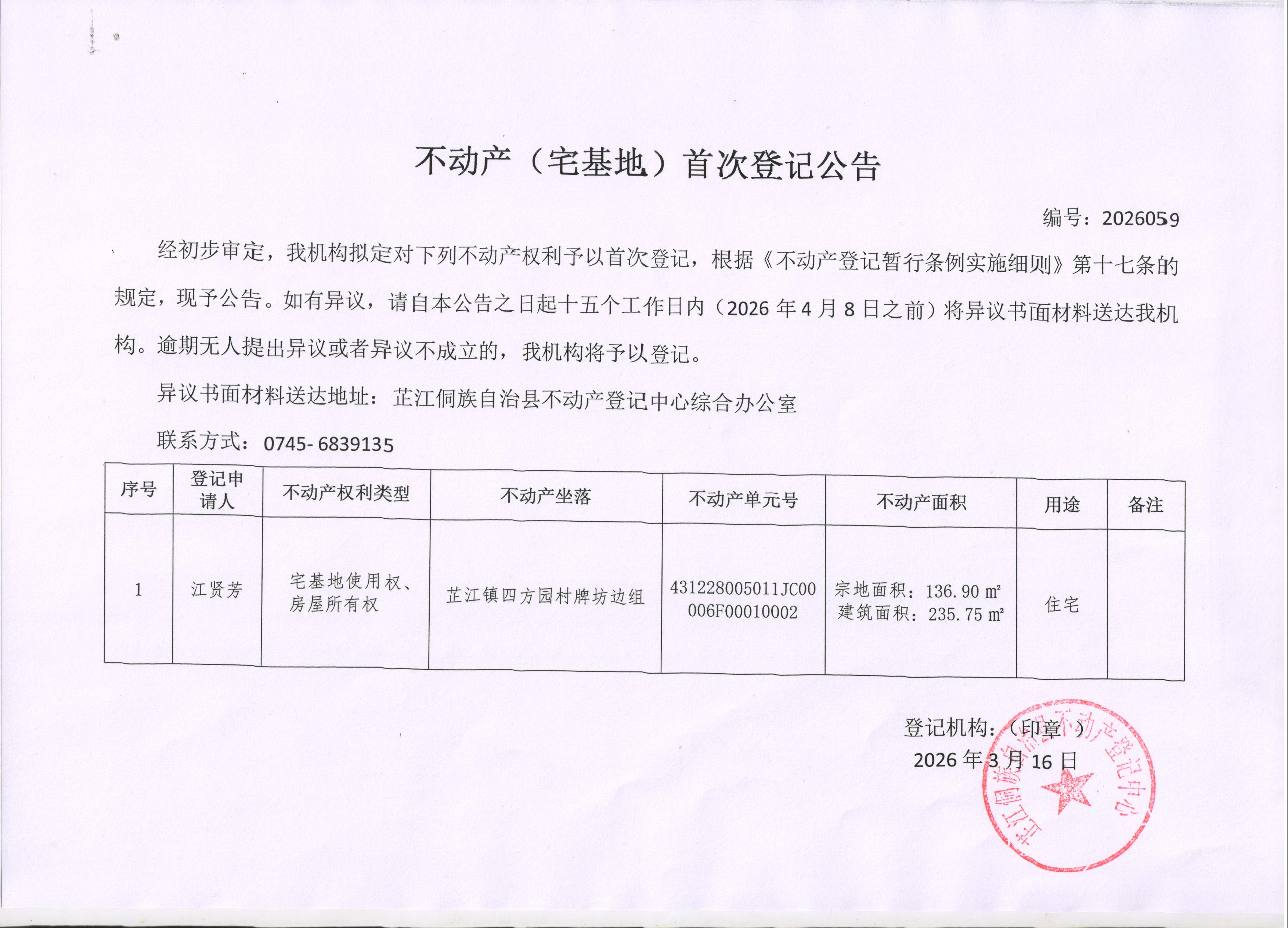不动产(宅基地)首次登记公告 编号:2026059
